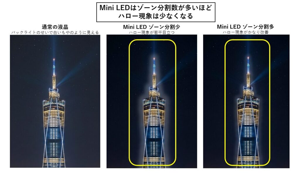 ミニLEDとは、従来のLEDディスプレイよりも小型のLEDバックライトを多数のゾーンに分割し、敷き詰めた液晶ディスプレイのこと。これにより、より細かな部分ごとに画面の明るさを制御できるようになり高いコントラストを実現できるようになった。具体的には576~2304ゾーンの製品が現在主流。