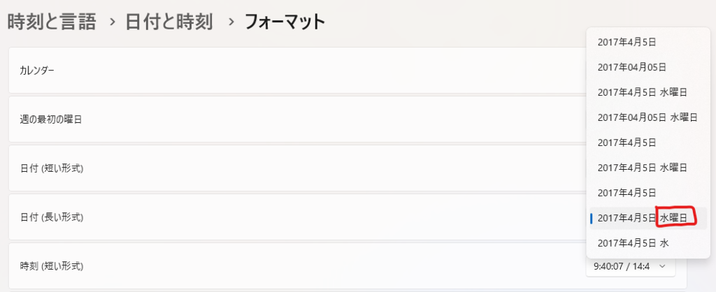 日付(長い形式)は日付と時刻設定を開いた際のフル表示に使用され、そして日付(短い形式)はタスクバーの日付と時刻表示に使用される。