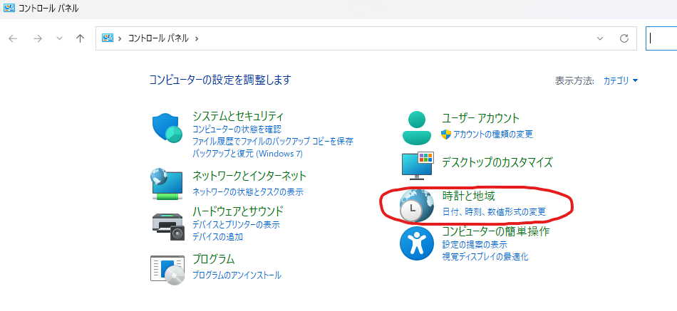 まずはコントロールパネルを開いて「時刻と地域」の設定項目に入る。