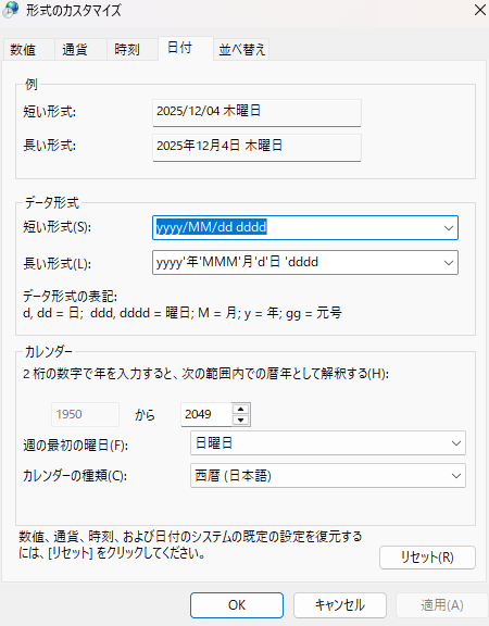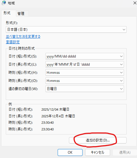 「地域」メニュー下部にある「追加の設定」を開くと別ウィンドウで「形式のカスタマイズ」が開く。