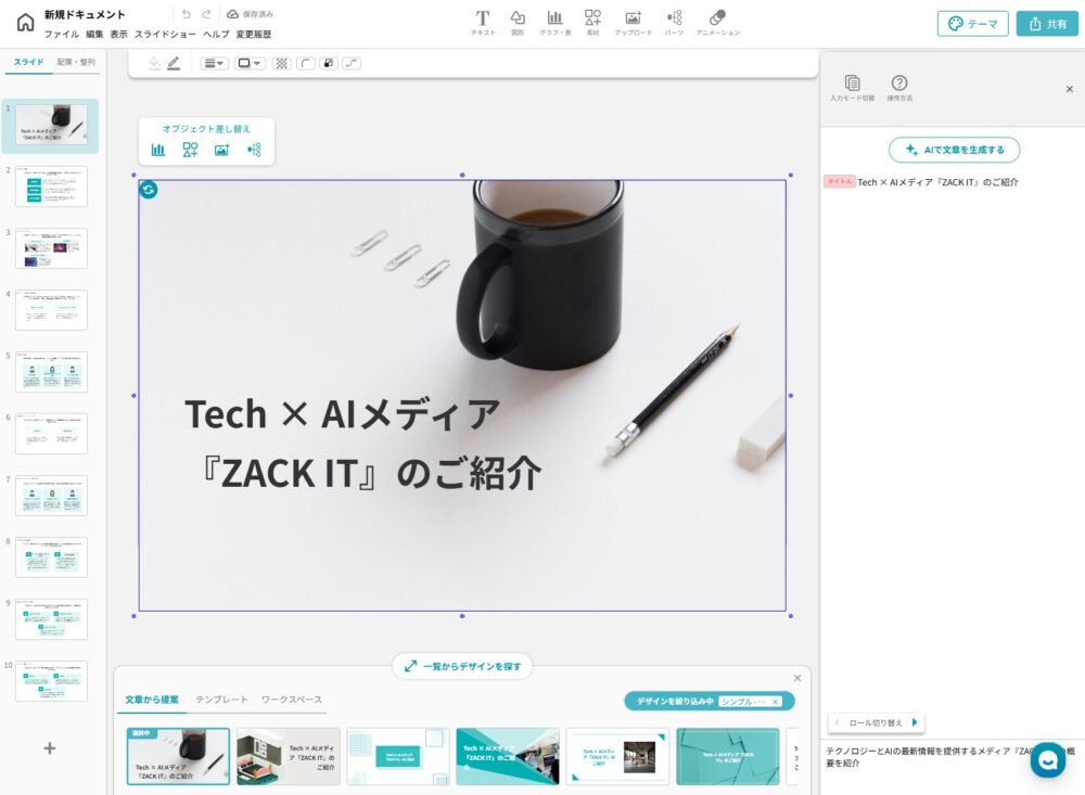 待つこと1分未満。簡単に資料ができてしまった。細かいテキストはもちろんここからでも編集が可能。使い勝手はデザイン作成ツール「Canva」に近いかも。