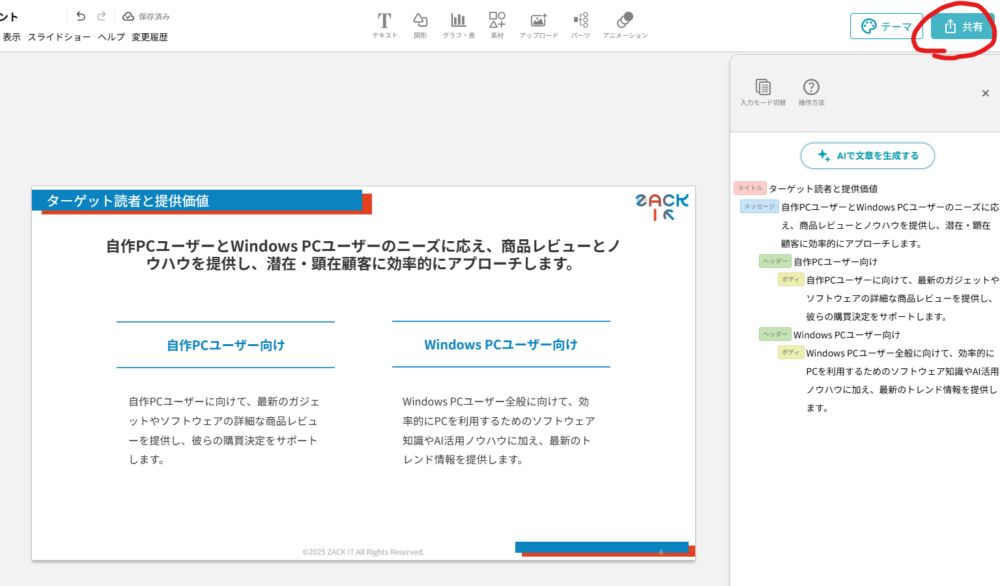 ある程度スライドに加えたい情報の追加・削除が終わって、問題がなければこれで画面右上の「本文テキストをAI生成」をクリックでスライドボディ作成される。